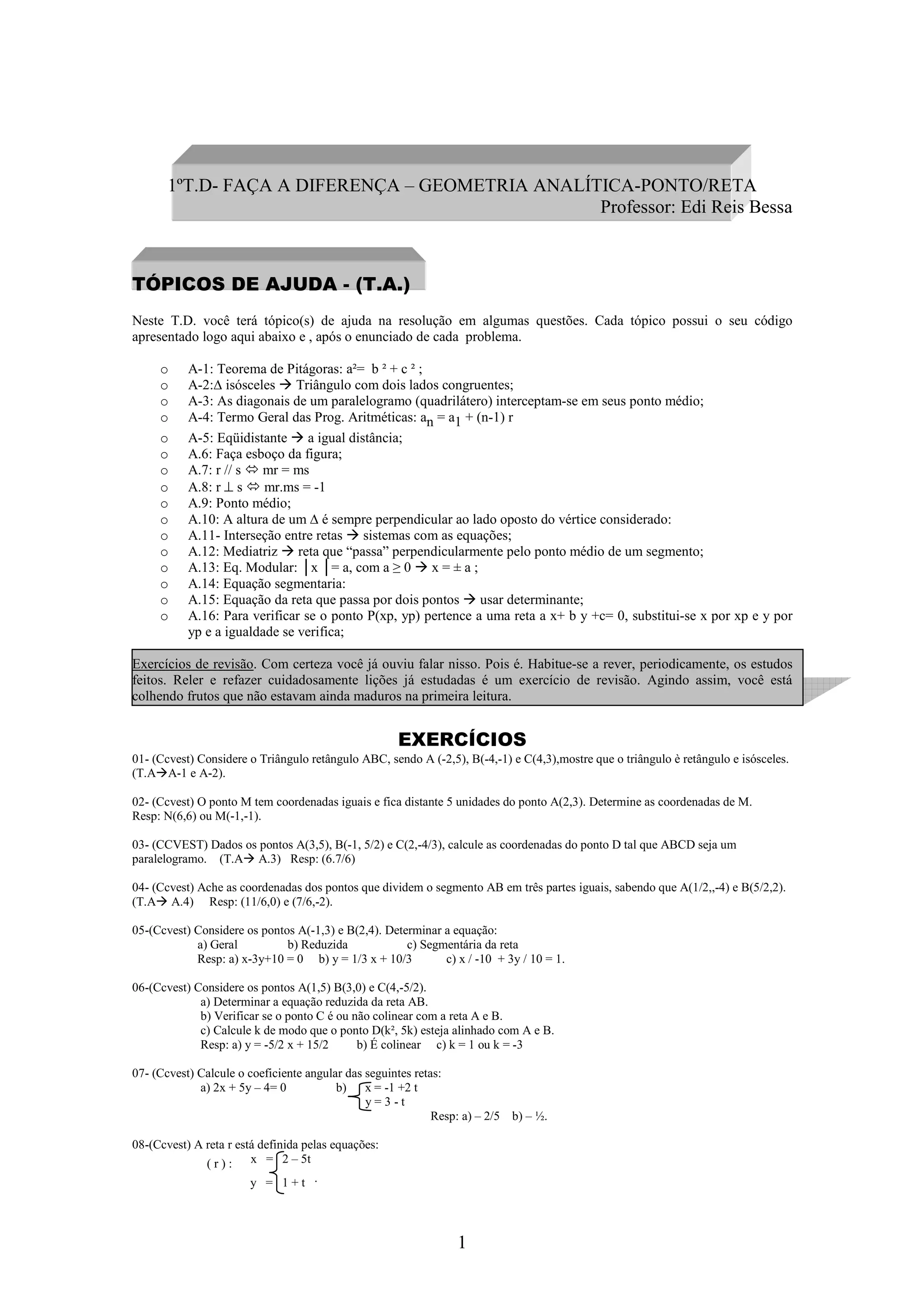 Este documento fornece instruções e exercícios sobre geometria analítica. Inclui tópicos de ajuda para resolver questões e 38 exercícios sobre pontos, retas, triângulos e paralelogramos. O objetivo é revisar e consolidar conceitos fundamentais de geometria analítica por meio da resolução de exercícios.