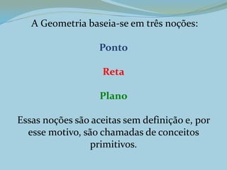 1. A geometria se baseia nos conceitos primitivos de ponto, reta e plano, que não podem ser definidos, mas sim entendidos por exemplos.