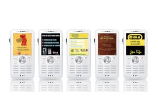 O documento discute o marketing mobile no Brasil, destacando que: (1) a empresa realizou 110 projetos mobile nos últimos 12 meses; (2) o celular conecta marcas e consumidores, com 154 milhões de linhas no país; e (3) há diversas estratégias de marketing mobile, como sites, aplicativos, Bluetooth e QR Codes.
