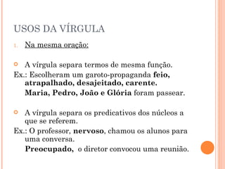 Este documento fornece instruções sobre o uso correto de sinais de pontuação no português, incluindo vírgula, dois pontos, ponto e vírgula, aspas, reticências, parênteses e travessão. Explica quando usar cada sinal de pontuação dentro e entre orações, para citações, enumerações, hesitações e comentários acessórios.