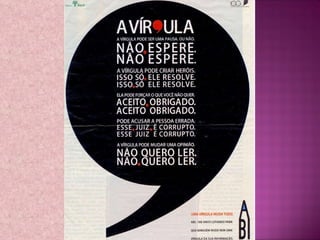 O documento explica as regras de pontuação no português brasileiro, incluindo o uso da vírgula para separar elementos na frase, como sujeitos compostos e orações coordenadas. Também discute o uso do ponto-e-vírgula para separar itens enumerados e orações sindéticas quando contêm conjunções pospostas.