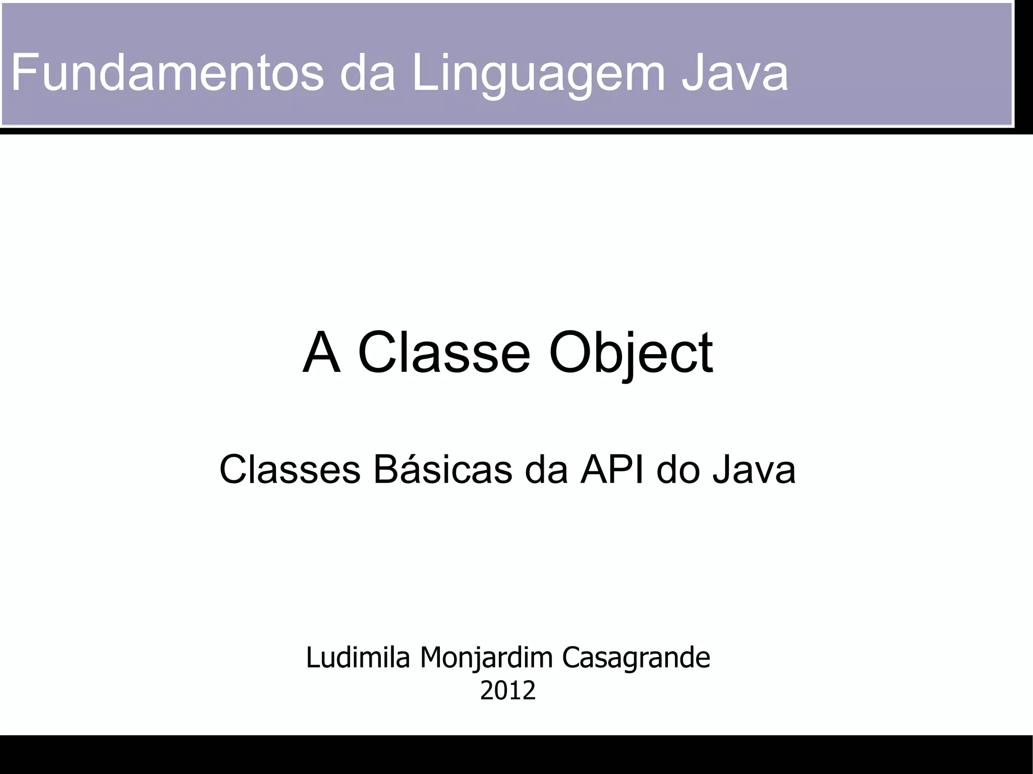 O documento descreve conceitos fundamentais da classe Object em Java, incluindo que toda classe estende Object implicitamente e herda seus métodos. Dois métodos importantes são toString() e equals(), que geralmente precisam ser sobrescritos para fornecer comportamentos apropriados às subclasses. O documento também explica como implementar corretamente o método equals() de acordo com suas especificações.