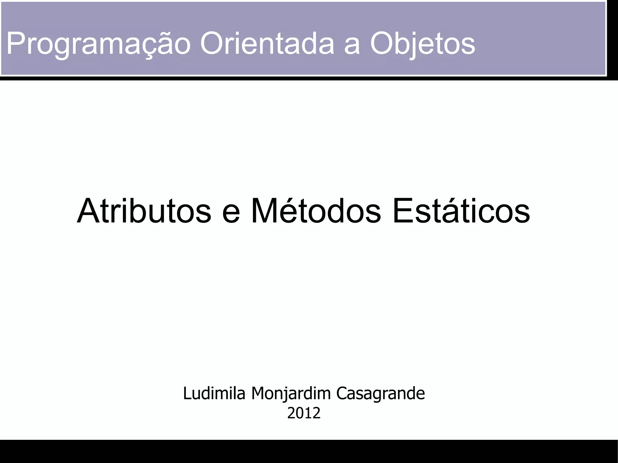 O documento discute elementos estáticos em programação orientada a objetos, especificamente atributos e métodos estáticos. Atributos estáticos podem ser compartilhados entre todas as instâncias de uma classe, ao contrário de atributos de instância que variam entre objetos. Métodos estáticos não requerem uma instância para serem chamados e geralmente manipulam dados estáticos ou recebem parâmetros. O modificador final impede a modificação de variáveis, métodos ou classes.