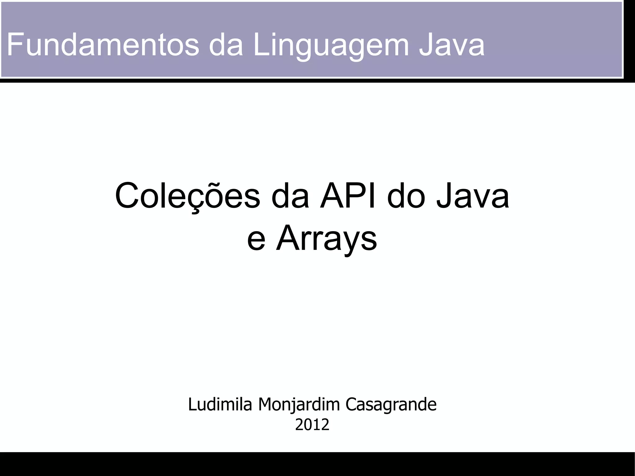 O documento discute arrays e coleções na API do Java. Ele explica que arrays são coleções homogêneas ordenadas e que há três passos para criar e usar arrays: declaração, construção e inicialização. Ele também descreve as principais interfaces de coleção - Collection, List e Set - e classes como ArrayList, incluindo como adicionar e recuperar elementos.