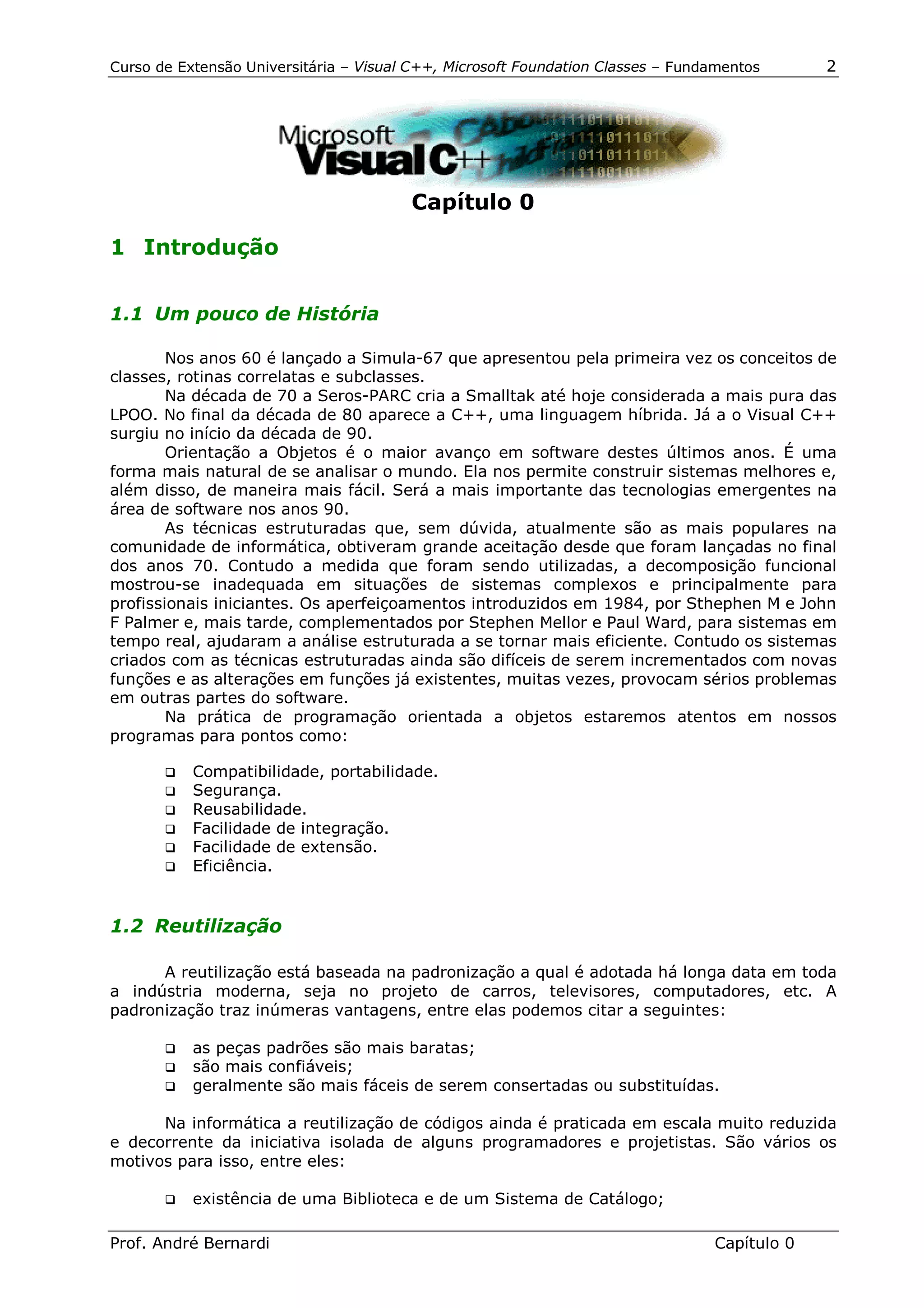 Este documento é uma apostila para um curso de extensão sobre MFC (Microsoft Foundation Classes) e apresenta conceitos básicos de programação orientada a objetos. O documento discute a história da programação orientada a objetos, princípios como encapsulamento e herança, e conceitos como classe, objeto, método e mensagem.