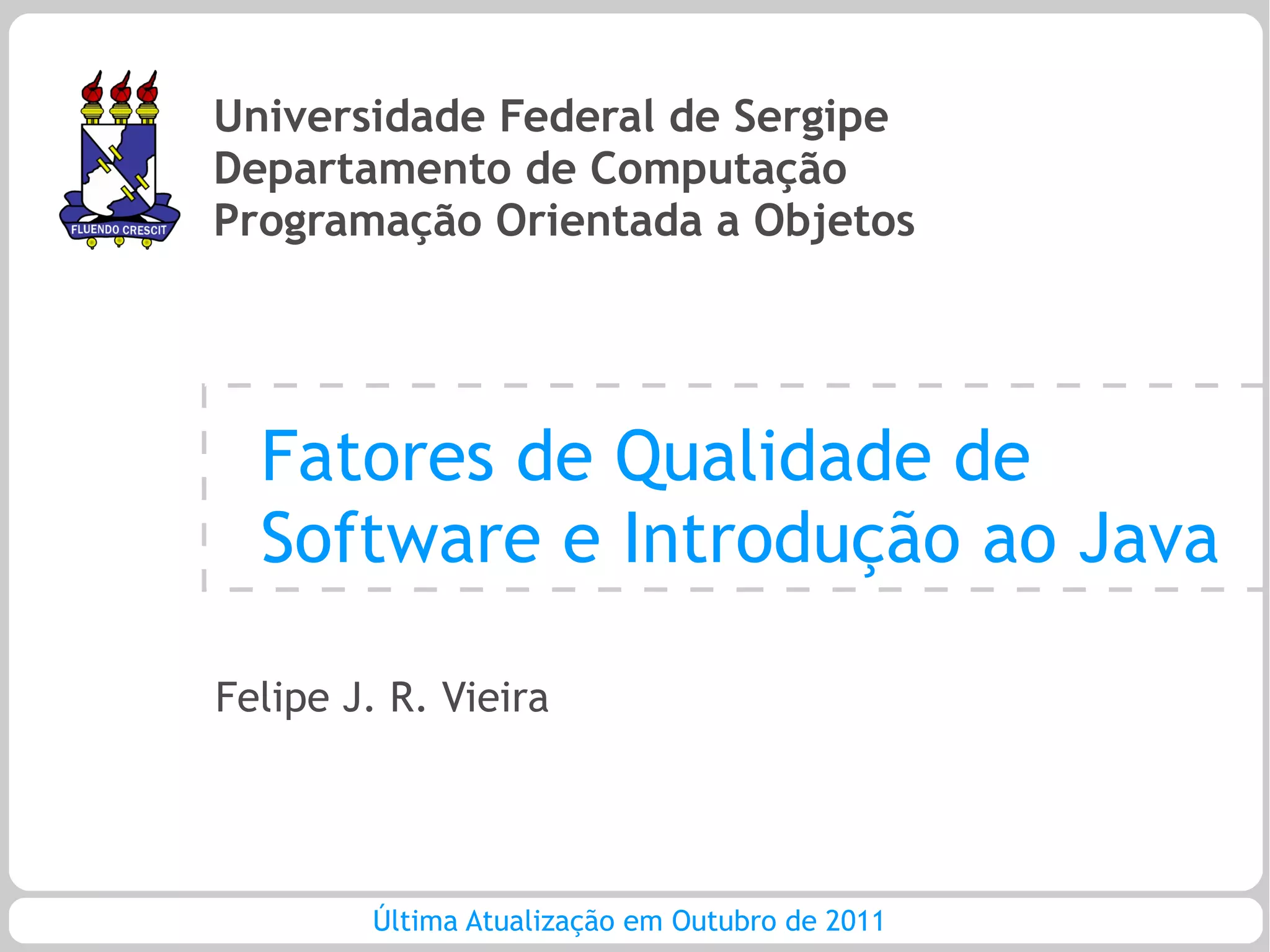 O documento aborda fatores de qualidade de software e introdução ao Java, destacando a importância do atendimento às expectativas dos clientes e as características que definem a qualidade. Discute requisitos de qualidade, visões de qualidade de software e métodos para desenvolver software de qualidade desde a fase inicial. Também inclui noções básicas de programação em Java, como tipos de dados, estruturas condicionais e comandos de repetição.