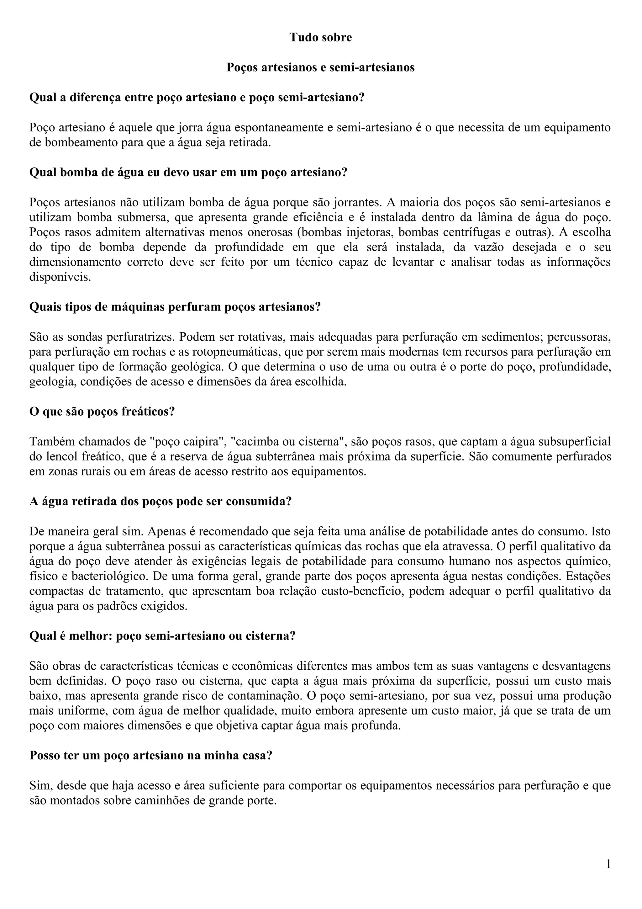 Poços artesianos jorram água espontaneamente enquanto semi-artesianos precisam de bombas. Bombas submersas são usadas em semi-artesianos devido à eficiência. Sondas perfuratrizes perfuram poços e o tipo usado depende de fatores como profundidade e geologia. Poços rasos captam água subsuperficial e podem ser consumidos após análise.