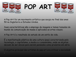 A Pop Art surgiu nos anos 1950 e usava imagens da cultura de massa em obras visuais para criticar a sociedade de consumo. Artistas como Roy Lichtenstein, Andy Warhol e Claes Oldenburg parodiavam histórias em quadrinhos, objetos produzidos em massa e ampliavam objetos cotidianos em grandes proporções para questionar a cultura americana.