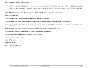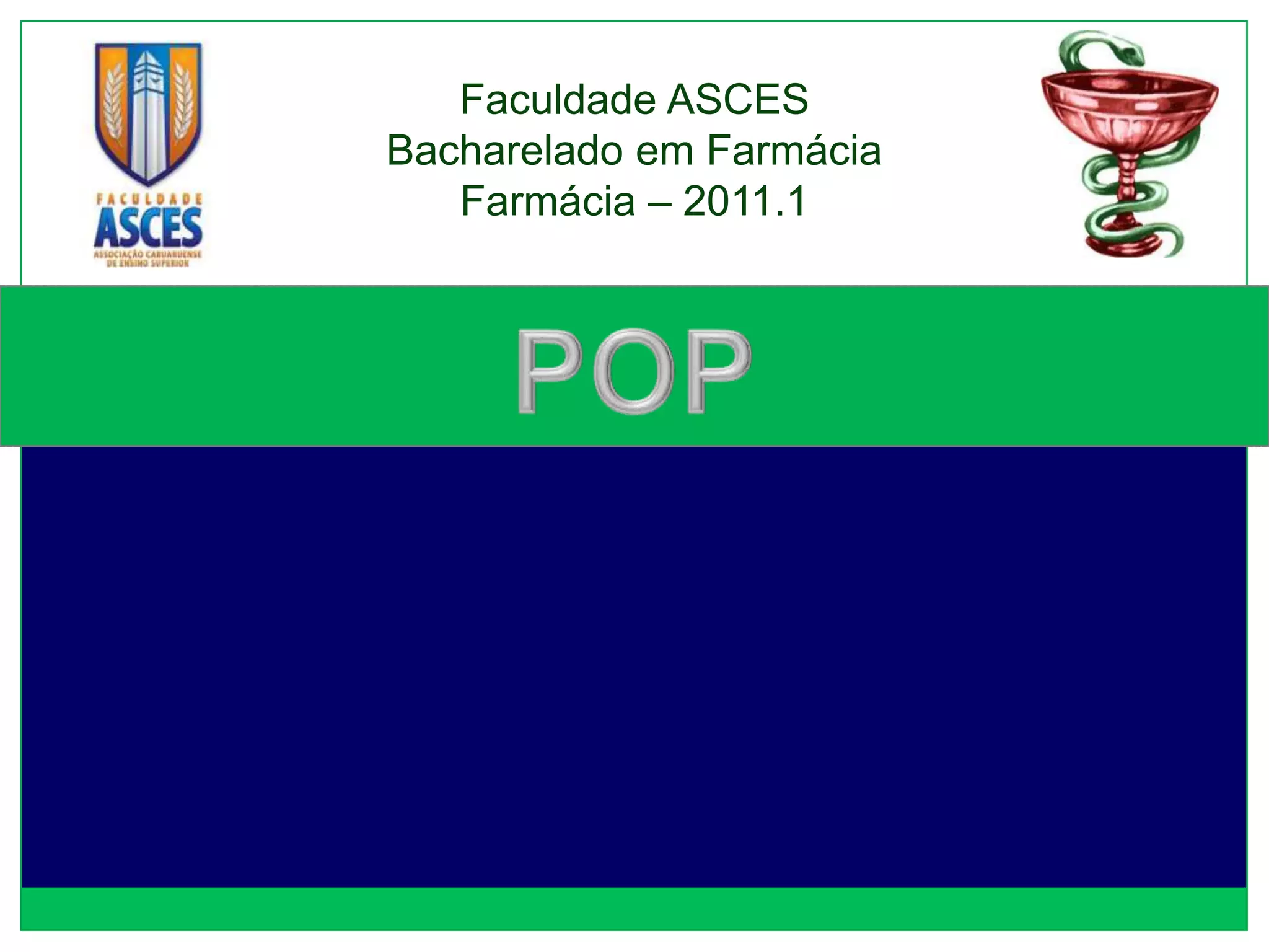 Este documento discute Procedimentos Operacionais Padrão (POP), definindo-os como manuais para padronizar atividades e garantir qualidade. Ele explica como fazer POPs, incluindo objetivos, estrutura, necessidade de treinamento e controle. Finalmente, lista requisitos regulatórios para POPs na área farmacêutica.