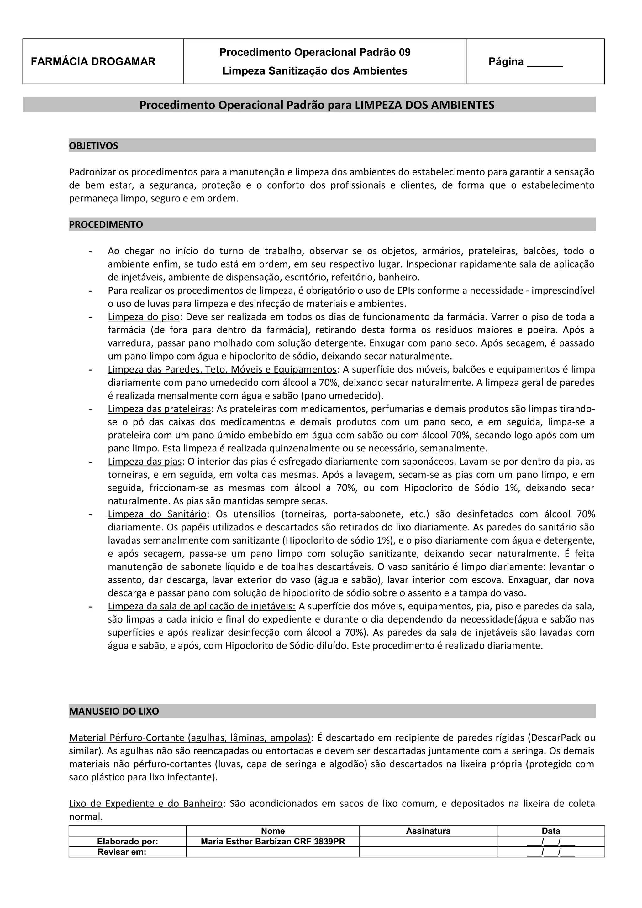 Este documento fornece diretrizes para limpeza e desinfecção de ambientes de uma farmácia. Ele descreve procedimentos diários, semanais e mensais para manter a limpeza do chão, paredes, móveis, banheiro e outros espaços. Também inclui instruções sobre descarte adequado de lixo hospitalar e medicamentos vencidos.