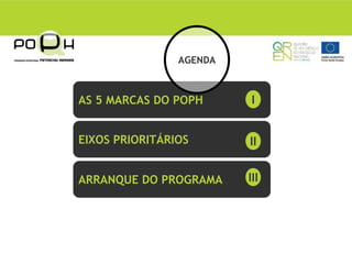 1) O documento descreve as cinco marcas do Programa Operacional Potencial Humano (POPH), os eixos prioritários e a agenda para a sessão de esclarecimento.