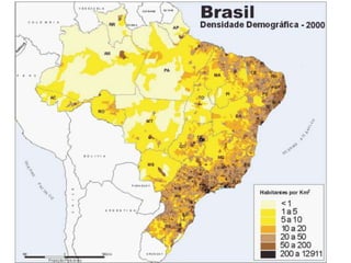 O documento apresenta dados sobre a população brasileira, incluindo sua densidade demográfica, taxas de crescimento, estrutura etária, indicadores sociais e econômicos. É destacado que o Brasil tem a quinta maior população do mundo e que as regiões Sudeste e Nordeste são as mais populosas, enquanto o Sul tem a maior densidade demográfica.