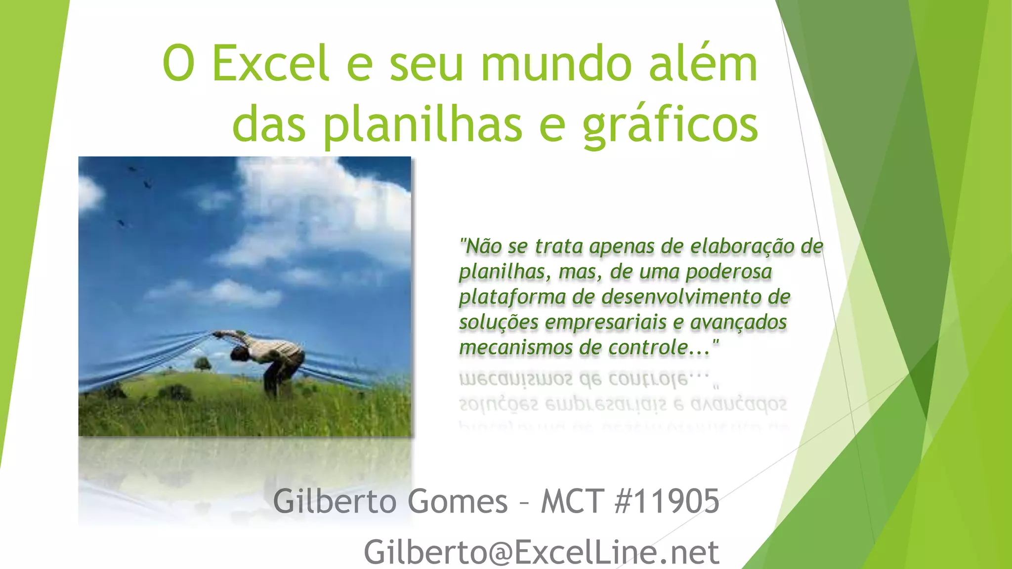 O documento discute como o Excel pode ser usado como uma poderosa plataforma para desenvolvimento de soluções empresariais e sistemas de gestão, permitindo a automação de processos e geração de relatórios a baixo custo. O autor argumenta que o Excel permite importar dados de sistemas externos, transformá-los em tabelas e gráficos dinâmicos para criar painéis de controle e sistemas de business intelligence.