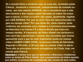 O documento discute as leis que regem a vida humana e o propósito da existência. Argumenta que assim como as leis da ciência regem o mundo físico, leis divinas regem a vida e o sofrimento humano. Essas leis são os princípios morais evangélicos de Cristo, que a ciência está estudando. A vida tem como objetivo evoluir espiritualmente através da experiência, e não apenas o prazer, para construir o homem consciente.