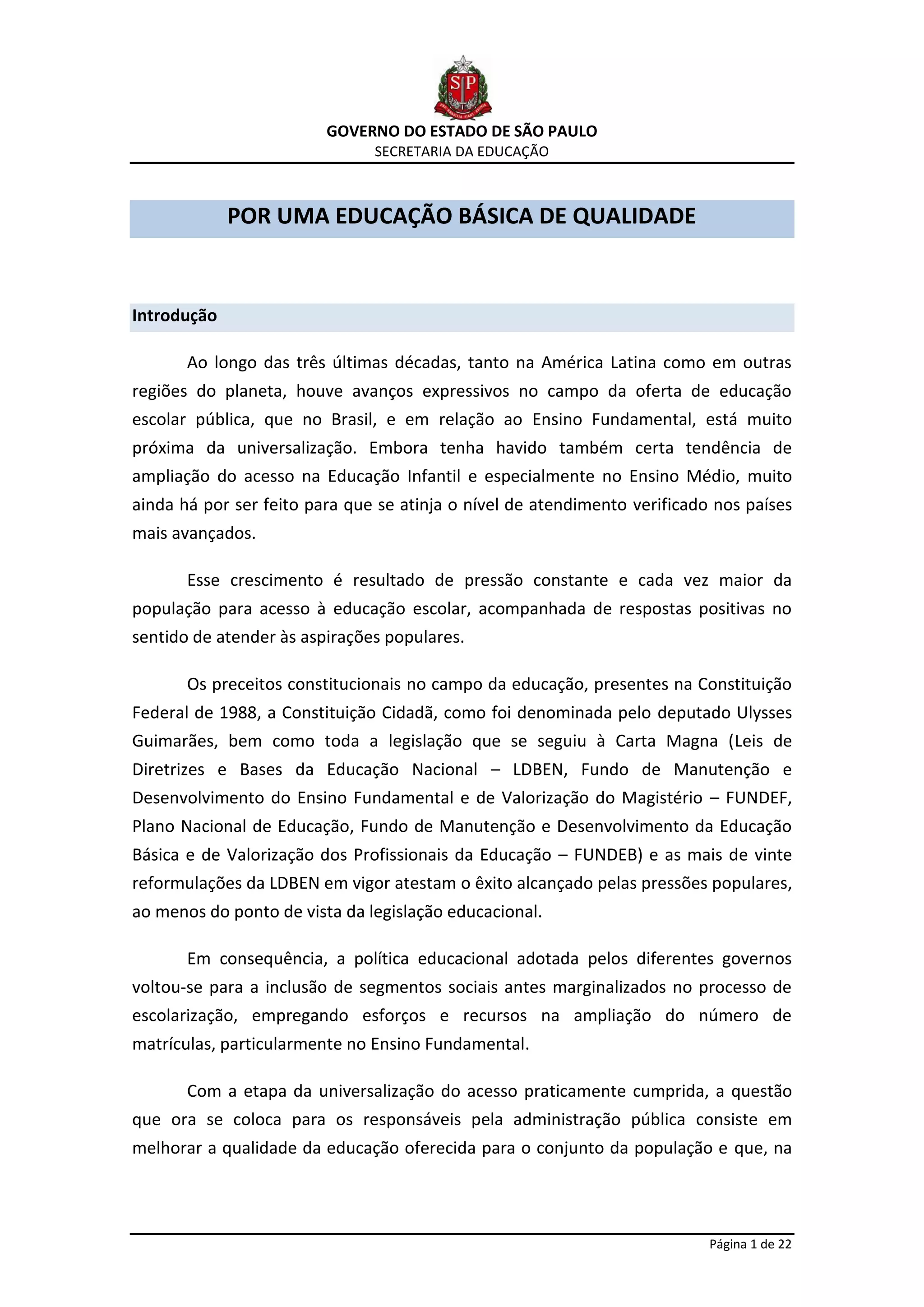 O documento discute a reorganização do Ensino Fundamental em São Paulo em ciclos de aprendizagem menores para melhorar a qualidade da educação. Ele argumenta que a educação deve ser estruturada em ciclos que respeitem o ritmo individual de cada estudante, com avaliações contínuas e programas de recuperação para garantir que todos aprendam. A proposta é reorganizar o Ensino Fundamental em três ciclos menores para melhor atender às necessidades dos alunos.