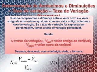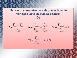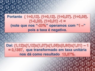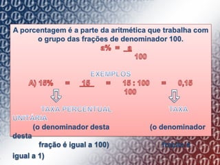 1) Para converter entre taxas percentuais e unitárias, deve-se dividir a taxa percentual por 100 para obter a unidade ou multiplicar a taxa unitária por 100 para obter a porcentagem.