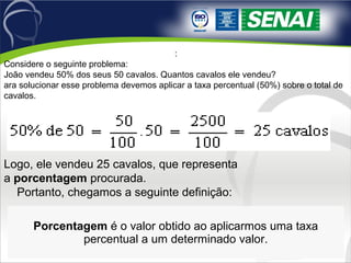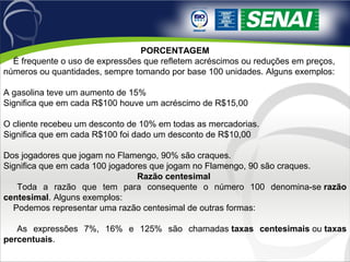 O documento explica conceitos de porcentagem e razão centesimal, apresentando exemplos de cálculos com porcentagens de acréscimos, descontos e proporções. Também apresenta problemas envolvendo porcentagem e suas soluções.