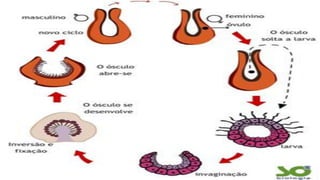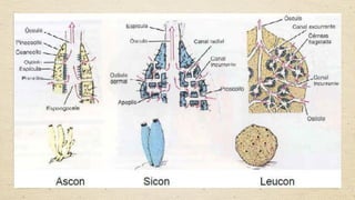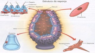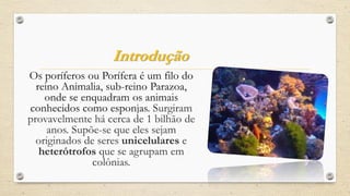 Os poríferos, também conhecidos como esponjas, são um filo do reino animal que surgiram há cerca de 1 bilhão de anos e apresentam características únicas, como a ausência de tecidos e órgãos definidos. Eles se alimentam filtrando água e podem se reproduzir de forma assexuada ou sexuada, com três tipos de estrutura corporal: ascon, sicon e leucon. Além de serem bioindicadores de qualidade da água, as esponjas têm importância na produção de compostos bioativos e na indústria de cosméticos.