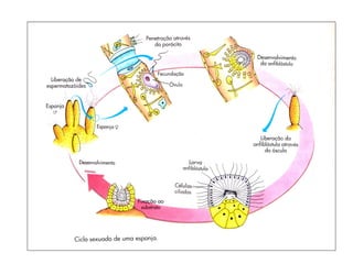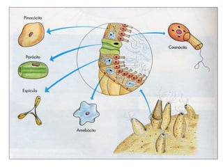 O documento descreve as características dos poríferos, incluindo sua estrutura celular e reprodutiva assimétrica, ausência de tecidos, filtragem de água, e reprodução assexuada e sexuada.