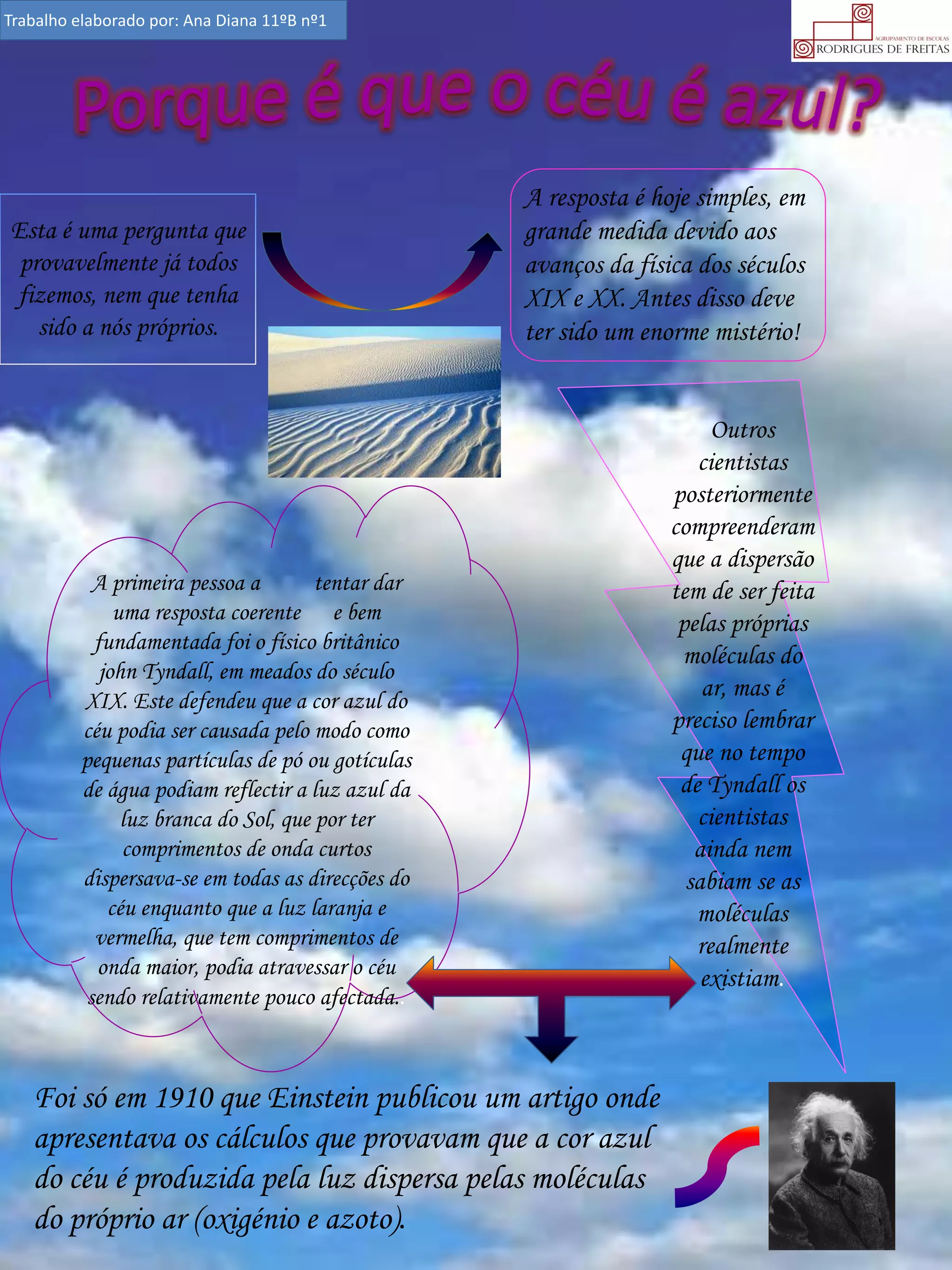 O documento explica que o céu é azul devido à dispersão da luz azul do sol pelas moléculas de oxigênio e nitrogênio na atmosfera. John Tyndall foi o primeiro a tentar explicar o fenômeno no século XIX, sugerindo que partículas de água e poeira dispersavam a luz azul. Somente em 1910 Einstein provou matematicamente que a cor é causada pela dispersão da luz pelas moléculas do ar.