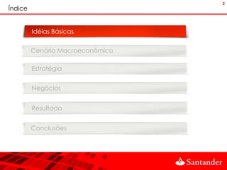 O Banco Santander (Brasil) apresentou resultados positivos no primeiro trimestre de 2011, com expansão comercial, integração concluída e crescimento de dois dígitos no volume de negócios. O lucro líquido foi de R$2,1 bilhões, 17,5% maior que no primeiro trimestre de 2010. A carteira de crédito ampliada cresceu 21,9% em 12 meses, puxada por consignado, imobiliário e cartões.