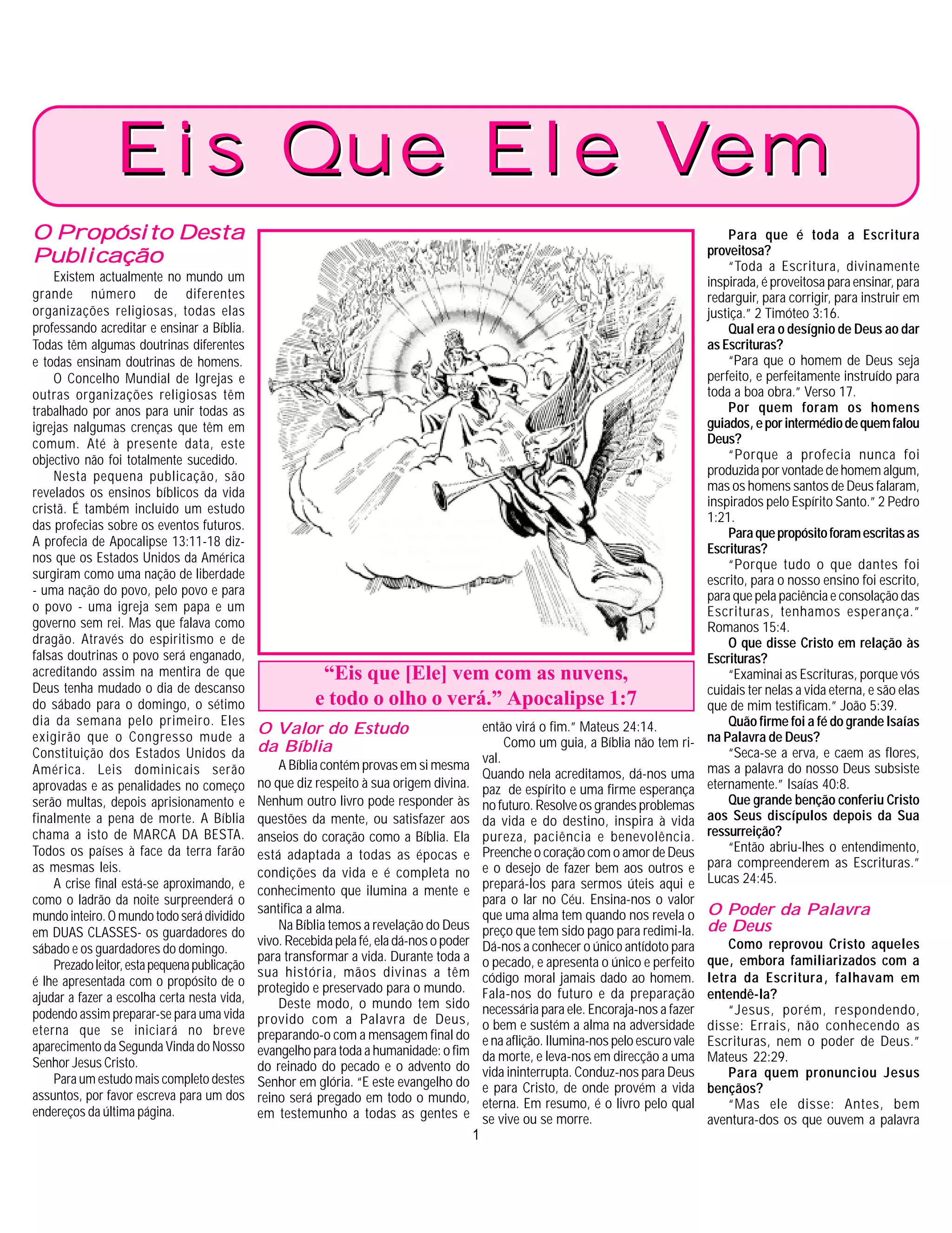Este documento explora os ensinamentos bíblicos sobre a vida cristã, profecias sobre eventos futuros e a importância das Escrituras para a salvação e moralidade. Destaca a importância de manter a observância do sábado e alerta sobre a introdução de falsas doutrinas que podem levar à marca da besta. O autor exorta os leitores a escolherem o caminho correto para a vida eterna e enfatiza a divina origem e relevância da Bíblia para a vida humana.