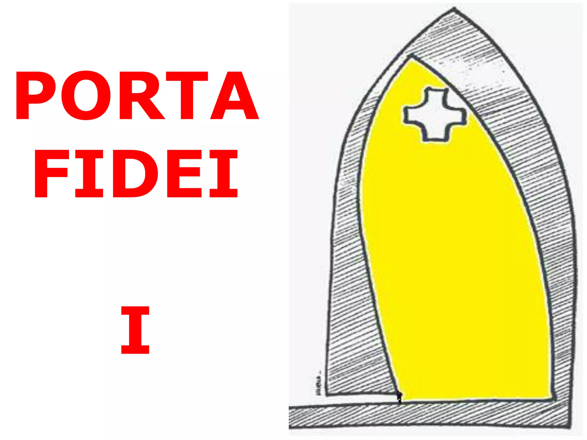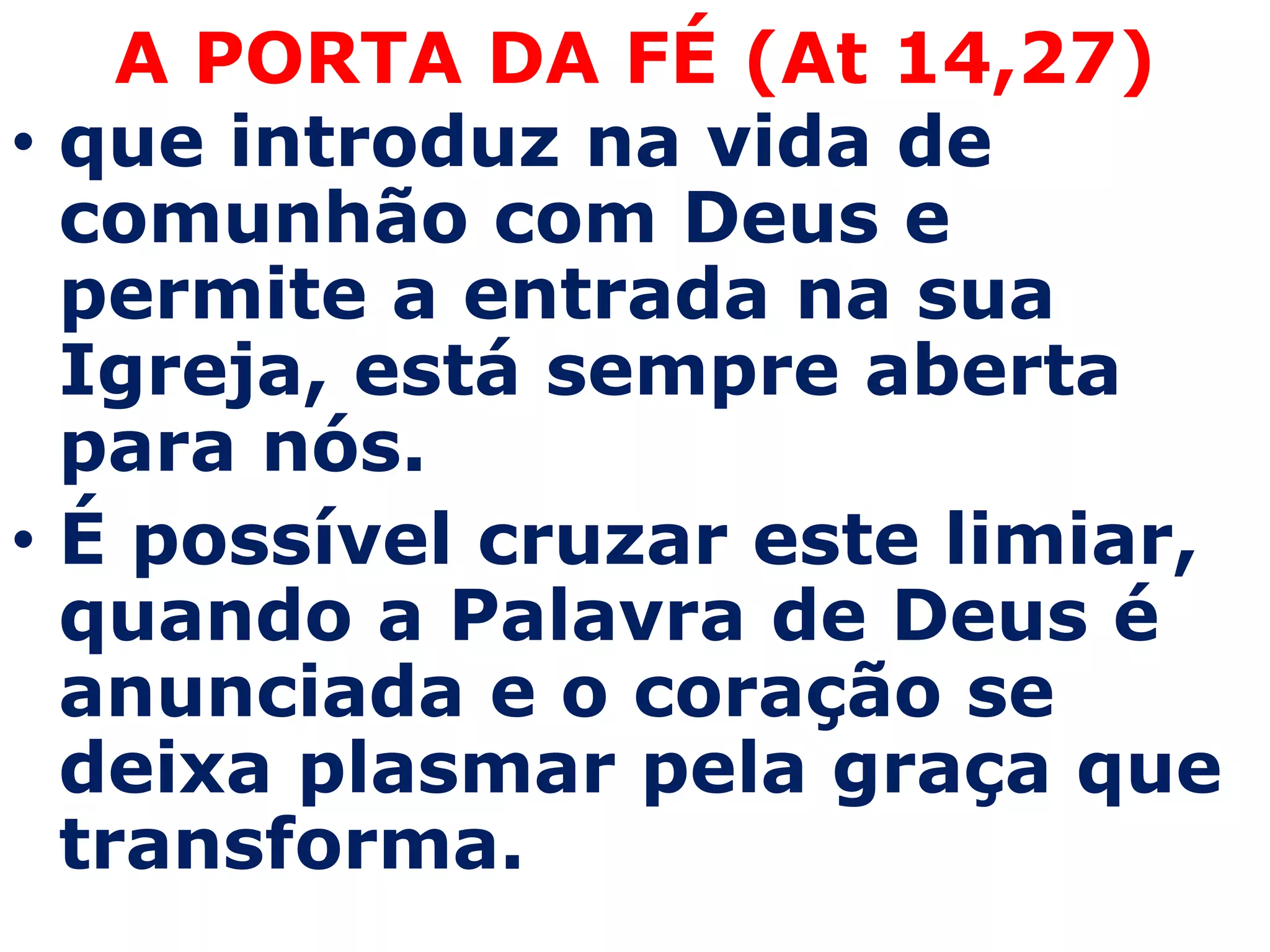 Este documento discute a "Porta da Fé" e como ela permanece aberta para permitir a entrada na Igreja e na vida de comunhão com Deus. Atravessar esta porta implica um caminho de fé que dura a vida toda e começa no batismo, culminando na vida eterna após a morte.
