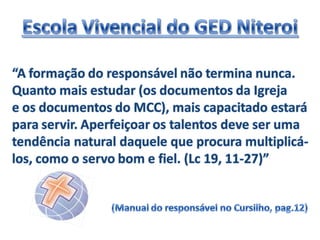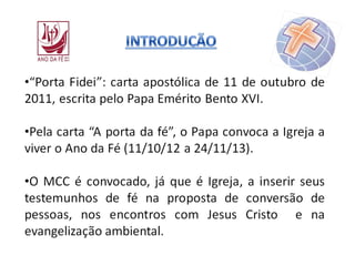 O documento discute como o Movimento de Cursilhos de Cristandade (MCC) pode promover a fé durante o Ano da Fé declarado pelo Papa Bento XVI. Ele fornece sugestões para o Pré-Cursilho, Cursilho e Pós-Cursilho, enfatizando o testemunho da fé e o estudo do Catecismo da Igreja Católica.