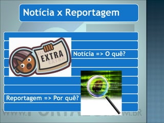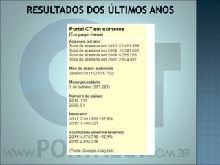 O documento discute a evolução do jornalismo online no Brasil, desde os primeiros sites de notícias até a criação do Portal CT em 2007. O texto também analisa como o público consome notícias online, com ênfase na velocidade de atualização e nos links e blocos que facilitam a hierarquização da informação. Por fim, apresenta dados sobre quais sites e blogs são mais acessados pelos usuários do Portal CT.