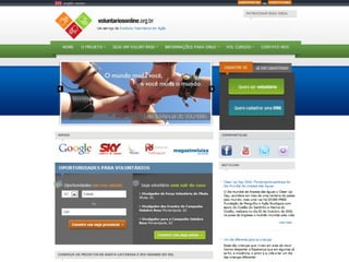 O documento descreve o portal Voluntários Online, que conecta voluntários a oportunidades em ONGs. Ele explica como o portal foi criado em parceria com a ONU e Google para promover o voluntariado digitalmente. O texto também fornece estatísticas sobre o uso do portal e histórias que demonstram seu impacto positivo.