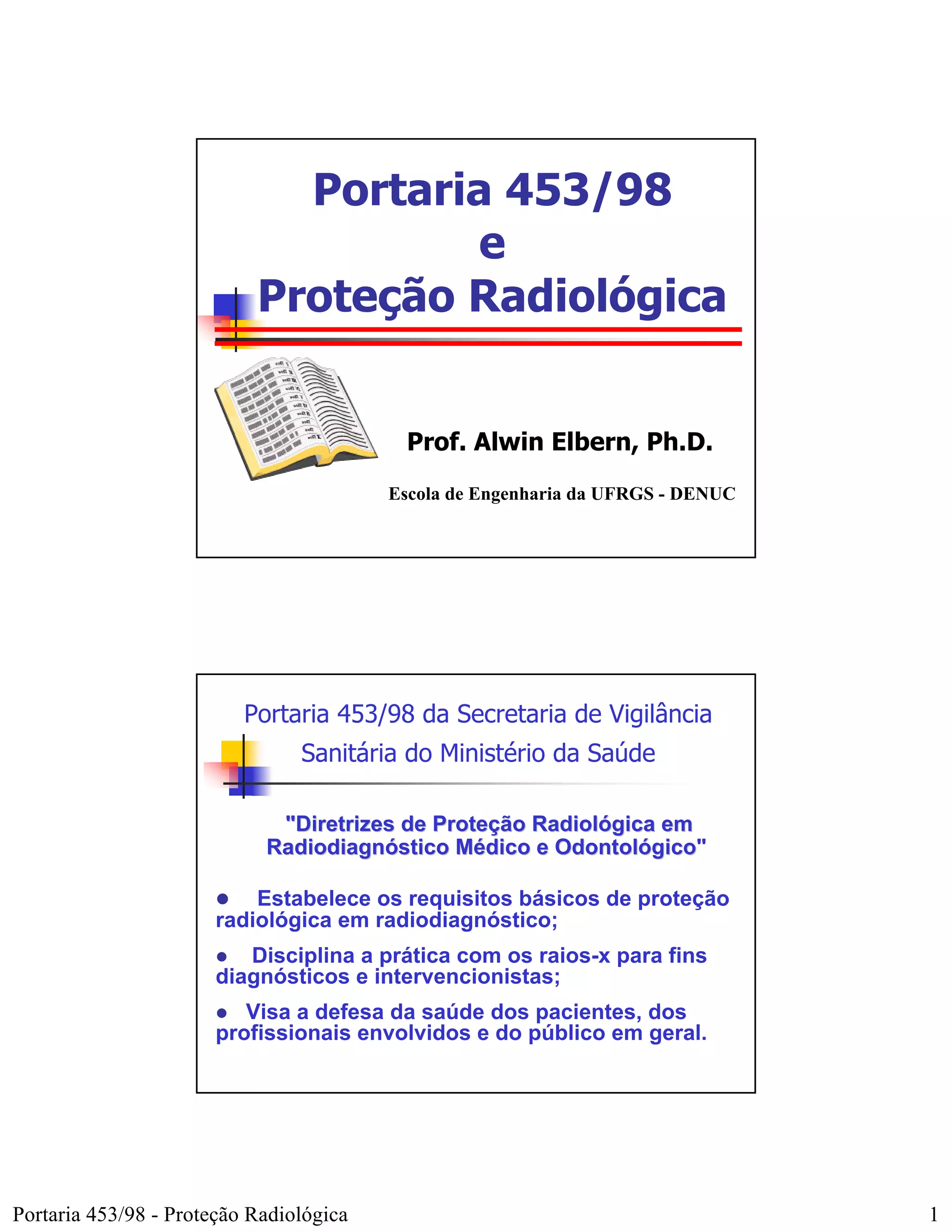 A Portaria 453/98 estabelece diretrizes de proteção radiológica em radiodiagnóstico médico e odontológico visando defender a saúde de pacientes, profissionais e público. A portaria regulamenta procedimentos de radiodiagnóstico, requisitos de instalações, qualificação profissional, monitoração de doses e controle de qualidade de equipamentos.