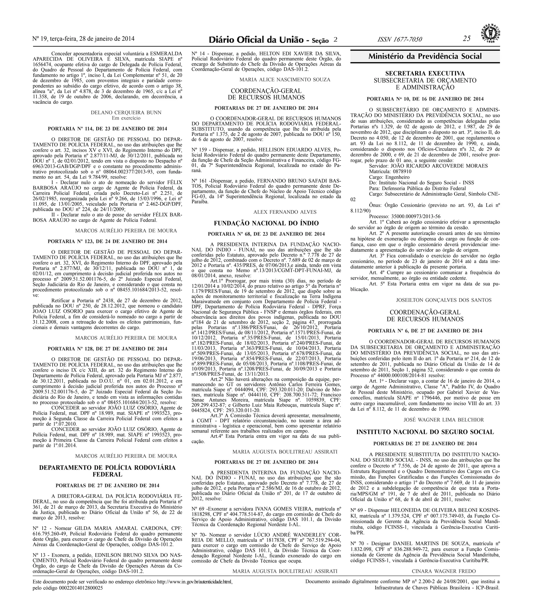 1) A portaria concede aposentadoria especial voluntária a Esmeralda Aparecida de Oliveira e Silva da Polícia Federal. 2) Outra portaria declara nulo o ato de nomeação e posse de Félix Barbosa Araújo como Agente de Polícia Federal. 3) Uma portaria retifica a nomeação de João Luiz Osorio como Agente de Polícia Federal considerando a data de 31/12/2008.