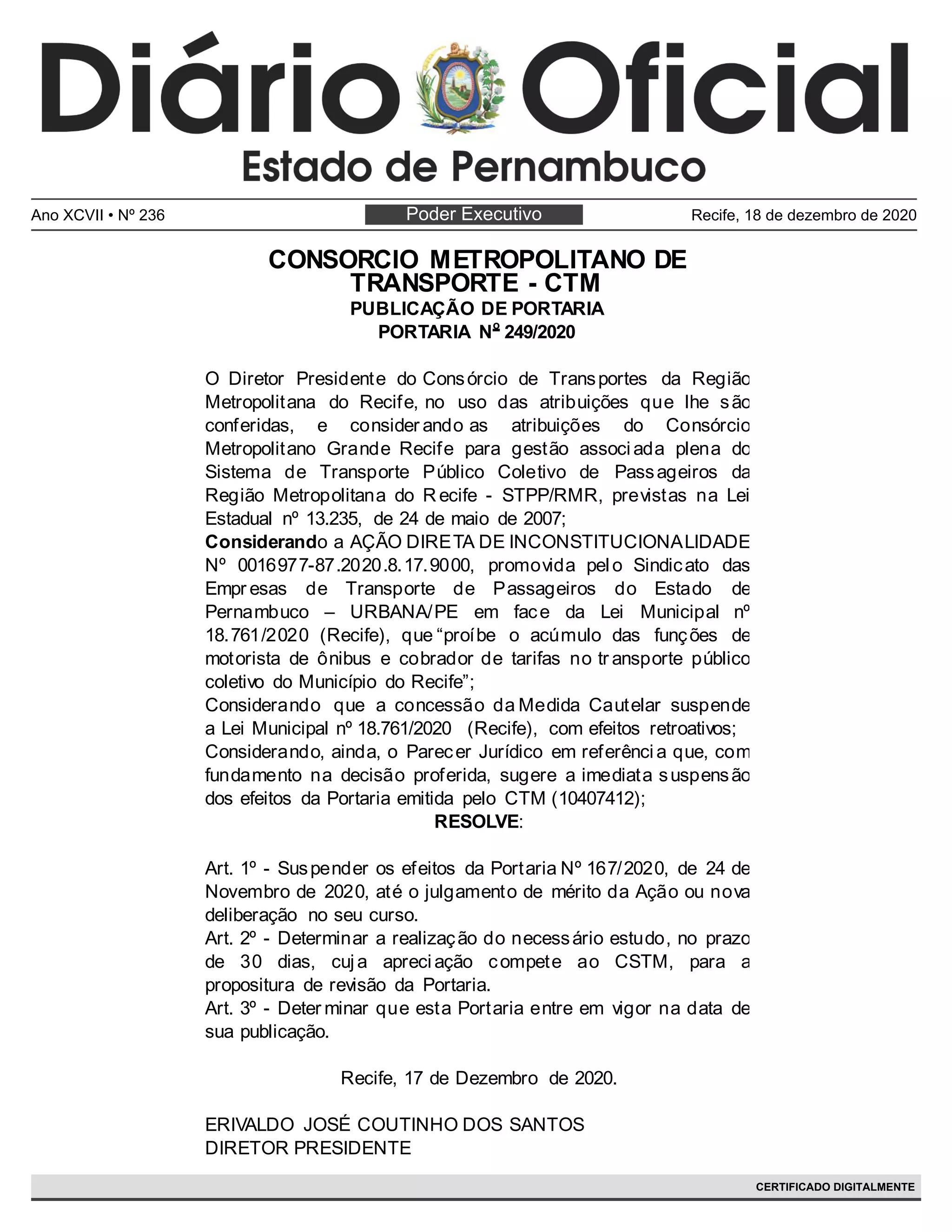A portaria suspende os efeitos de uma portaria anterior do Consórcio de Transportes da Região Metropolitana do Recife que proibia motoristas de ônibus de também cobrarem tarifas, devido a uma ação judicial que suspendeu a lei municipal sobre o assunto. A portaria determina um estudo sobre o tema e a revisão da portaria anterior nos próximos 30 dias.