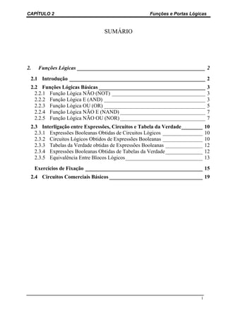 Este documento descreve as funções lógicas básicas utilizadas em circuitos digitais, incluindo: