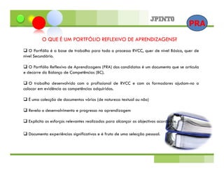 Este documento fornece orientações sobre como construir um Portfólio Reflexivo de Aprendizagens (PRA) para o processo de Reconhecimento, Validação e Certificação de Competências (RVCC). O PRA deve ser um documento pessoal que reflete as competências adquiridas pelo adulto ao longo da vida através de uma narrativa autobiográfica reflexiva. O adulto deve estruturar o PRA organizando as evidências das suas competências de acordo com as áreas de referência do RVCC.