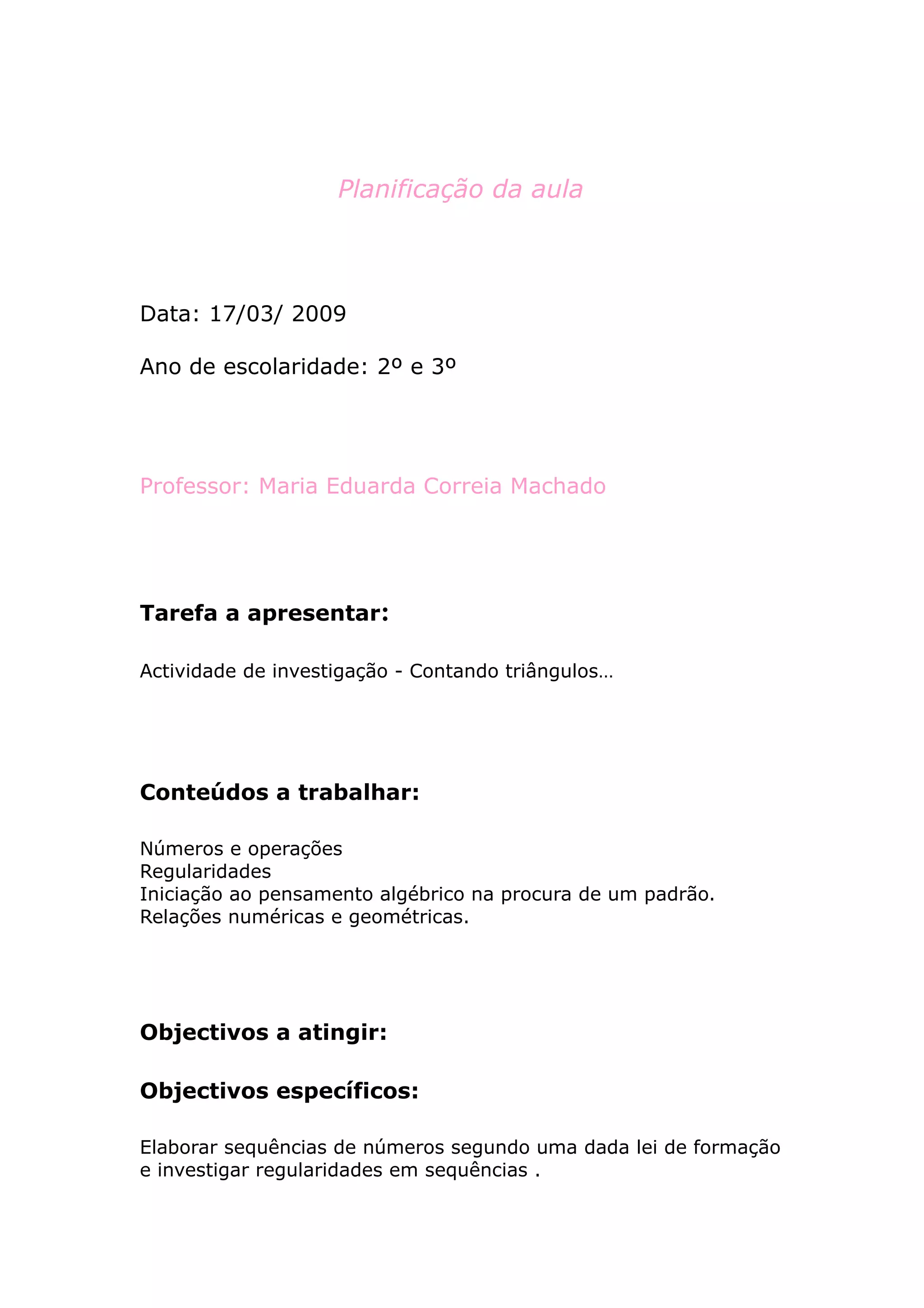 Este documento descreve uma aula planejada para estudantes do 2o e 3o ano. A aula envolverá uma atividade de investigação sobre triângulos para trabalhar conceitos matemáticos como números, operações e padrões. O objetivo é ajudar os alunos a reconhecer padrões e relações matemáticas.