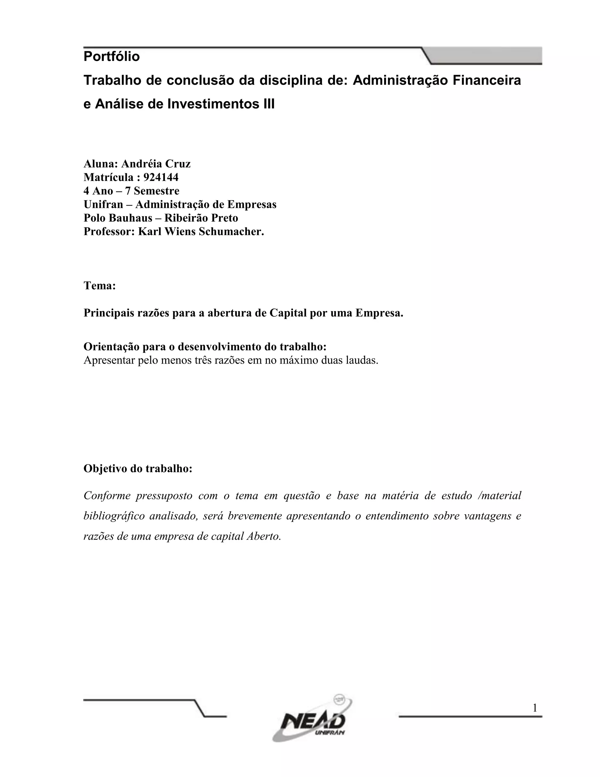 O documento discute as principais razões para uma empresa abrir seu capital. Ele explica que abrir o capital permite que uma empresa arrecade recursos para financiar projetos de investimento por meio da venda de ações, ao invés de tomar empréstimos. Também destaca que uma empresa de capital aberto ganha mais credibilidade no mercado e visibilidade, e pode usar suas ações como moeda de troca para aquisições de outras companhias.