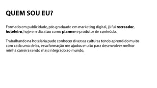 Este currículo resume a formação, experiência profissional e casos de sucesso de um profissional de marketing digital. Ele possui formação em marketing e pós-graduação em marketing digital, e trabalhou em agências desenvolvendo estratégias para marcas como NBA, Adidas, Bayern de Munique e Flamengo. Atualmente, ele planeja as estratégias digitais de celebridades musicais.