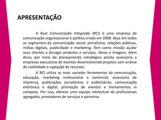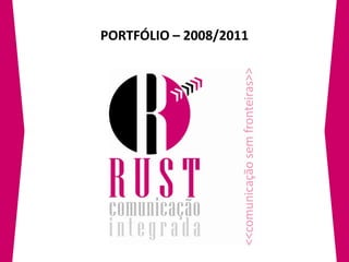 Este documento apresenta os resumos de projetos de comunicação desenvolvidos pela empresa Rust Comunicação Integrada entre 2008-2011. Os projetos incluem a criação de marcas, cartões de visita, peças publicitárias e assessoria de comunicação para diversos clientes nos setores de beleza, alimentação, música e eventos.