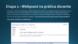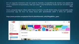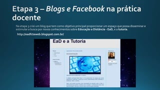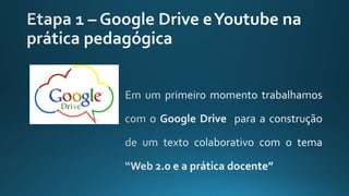 O documento discute o uso de ferramentas digitais como Google Drive, Webquest, Blogger, YouTube, Facebook e Slideshare no ensino-aprendizagem. Ele objetiva elaborar atividades de aprendizagem usando redes sociais para auxiliar a prática docente e refletir sobre como essas ferramentas afetam a educação.