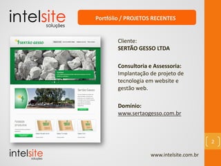 O documento lista 12 projetos recentes de uma consultoria para implantação e reformulação de websites e sistemas de gestão web para clientes de diversos setores. É fornecido o nome do cliente, breve descrição do escopo do projeto e o domínio de cada site.