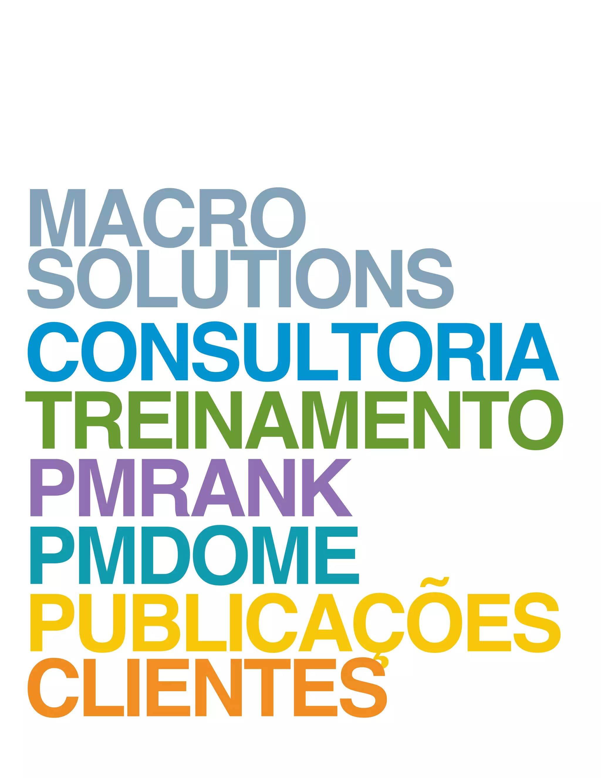 O documento fornece informações sobre os serviços de consultoria e treinamento oferecidos pela empresa Macrosolutions. A empresa oferece consultoria em gerenciamento de projetos, portfólios, riscos e PMOs, além de treinamentos customizados para empresas. Macrosolutions tem experiência internacional reconhecida e utiliza metodologias e padrões do PMI e outros organismos.