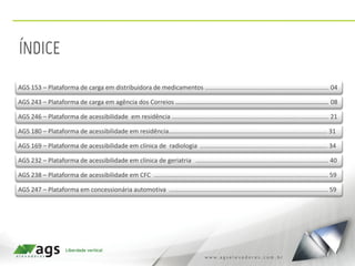 O documento apresenta um portfólio de plataformas de carga e acessibilidade em diferentes localidades de Porto Alegre e região, descrevendo suas especificações, como capacidade de peso e número de paradas. As plataformas estão distribuídas em diversos locais, incluindo distribuidoras de medicamentos, agências dos correios, residências, clínicas e concessionárias automotivas. Cada entrada contém detalhes sobre a capacidade parece do equipamento e o contexto onde está instalado.