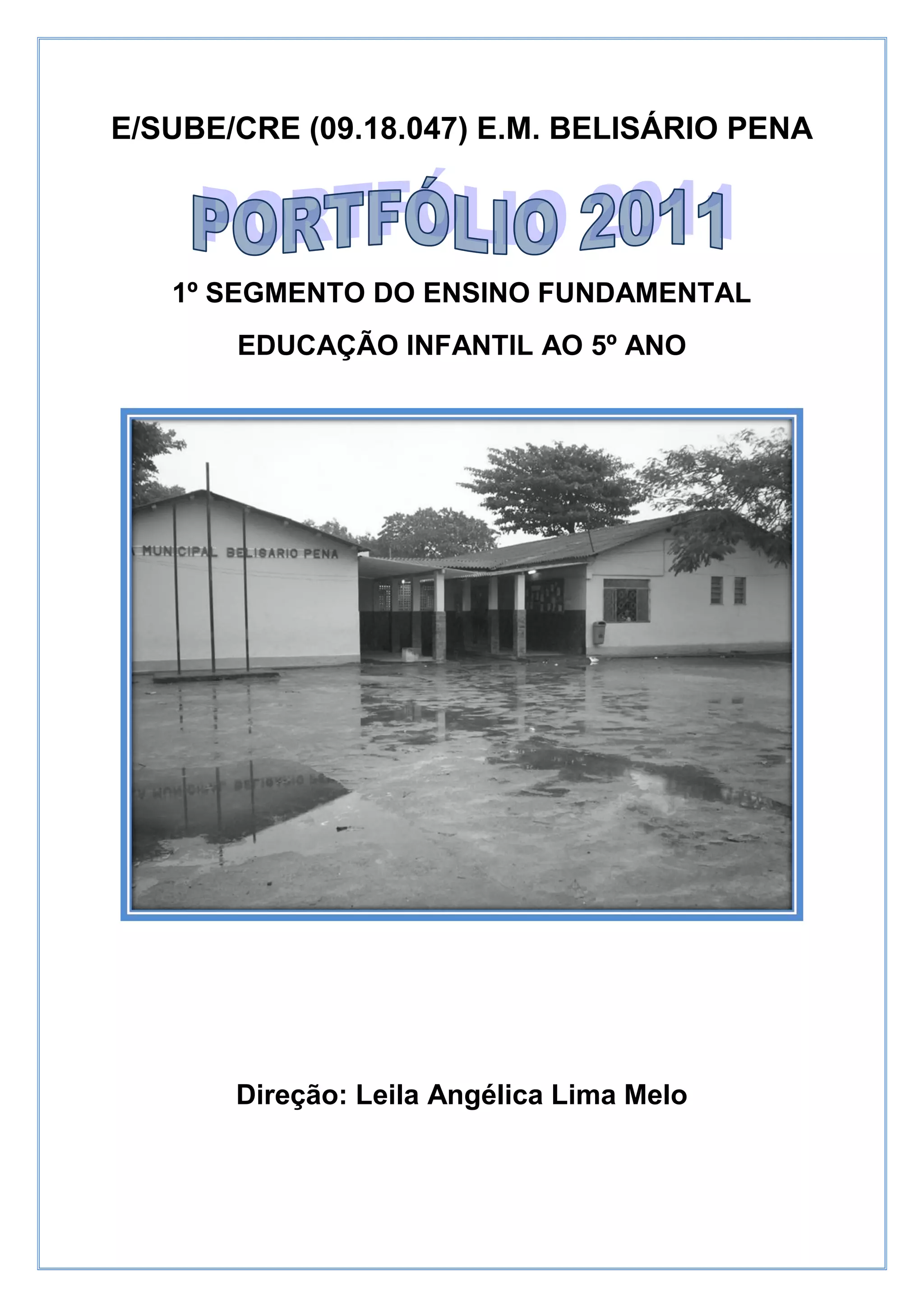 O documento apresenta um portfólio demonstrativo com os trabalhos realizados pela Escola Municipal Belisário Pena no 1o segmento do ensino fundamental em 2011, incluindo: