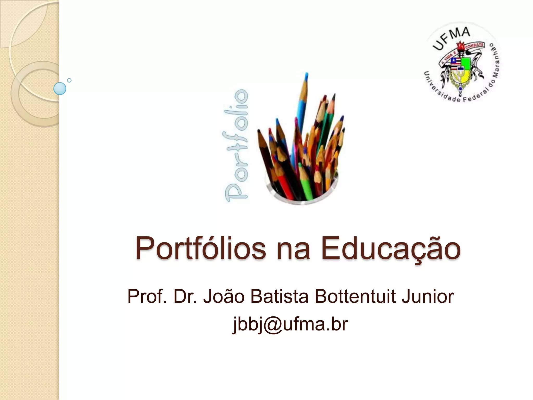 O documento discute o conceito e uso de portfólios na educação. Apresenta: 1) Definições de portfólio e seus tipos; 2) Como os portfólios podem ser construídos e suportados; 3) Vantagens dos portfólios para estudantes e professores ao promover reflexão e avaliação.