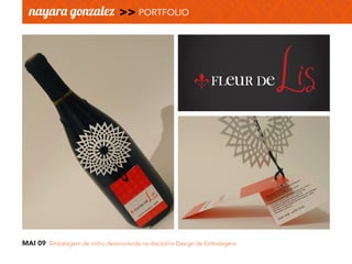 O documento lista projetos de design gráfico realizados entre 2009-2011, incluindo embalagens de vinho, logotipos, padronagens para marca de roupas, folders para eventos culturais, cadernos de programação e catálogos de exposição. Também inclui o currículo da designer com formação, experiências e habilidades.