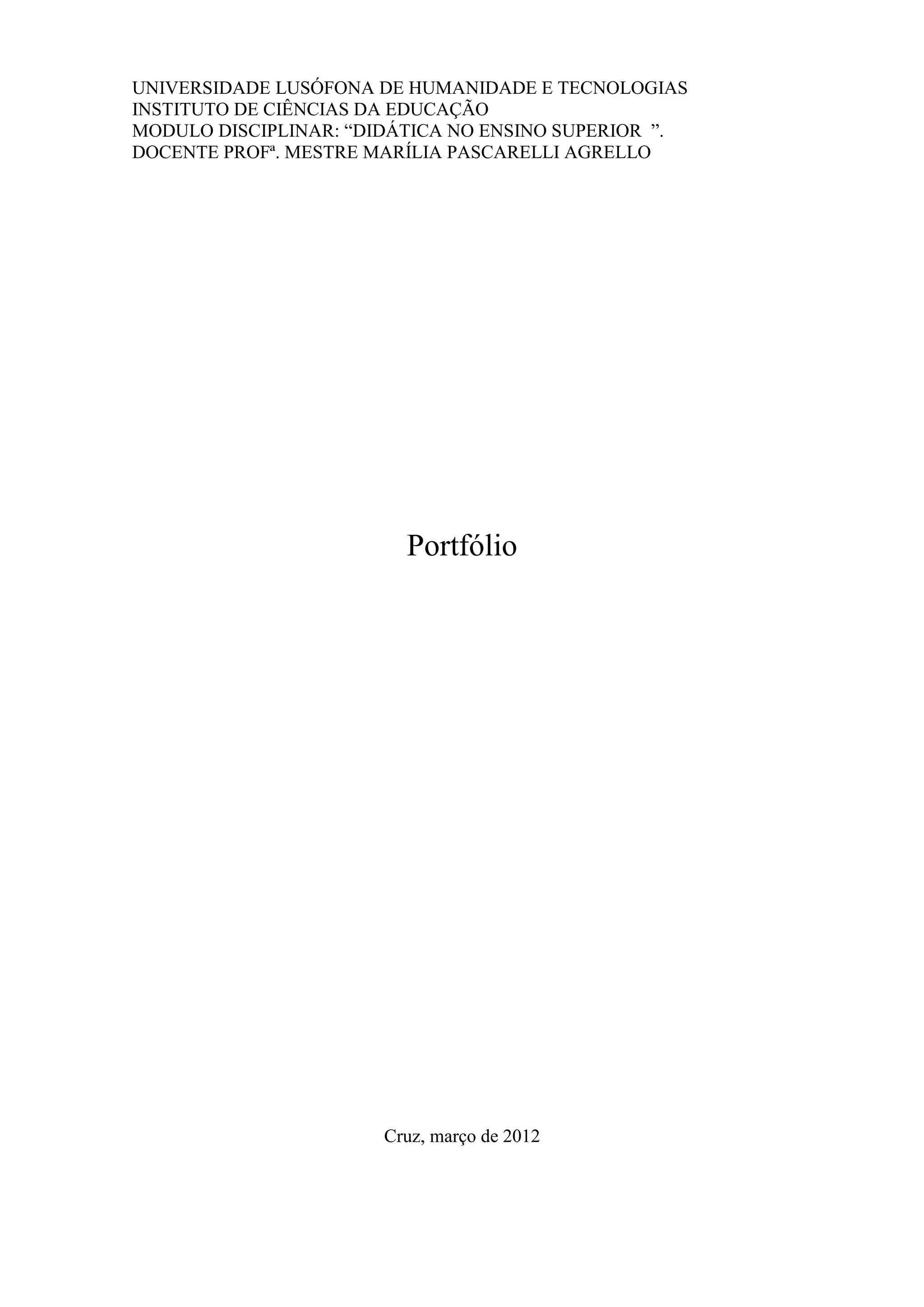 O documento resume um portfólio sobre o módulo disciplinar "Didática no Ensino Superior" ministrado por professora Marília Pascarelli Agrello. O portfólio inclui uma introdução sobre o processo de ensino-aprendizagem e a importância da didática, seguido de atividades realizadas na disciplina como debates, dinâmicas e análise de filmes.