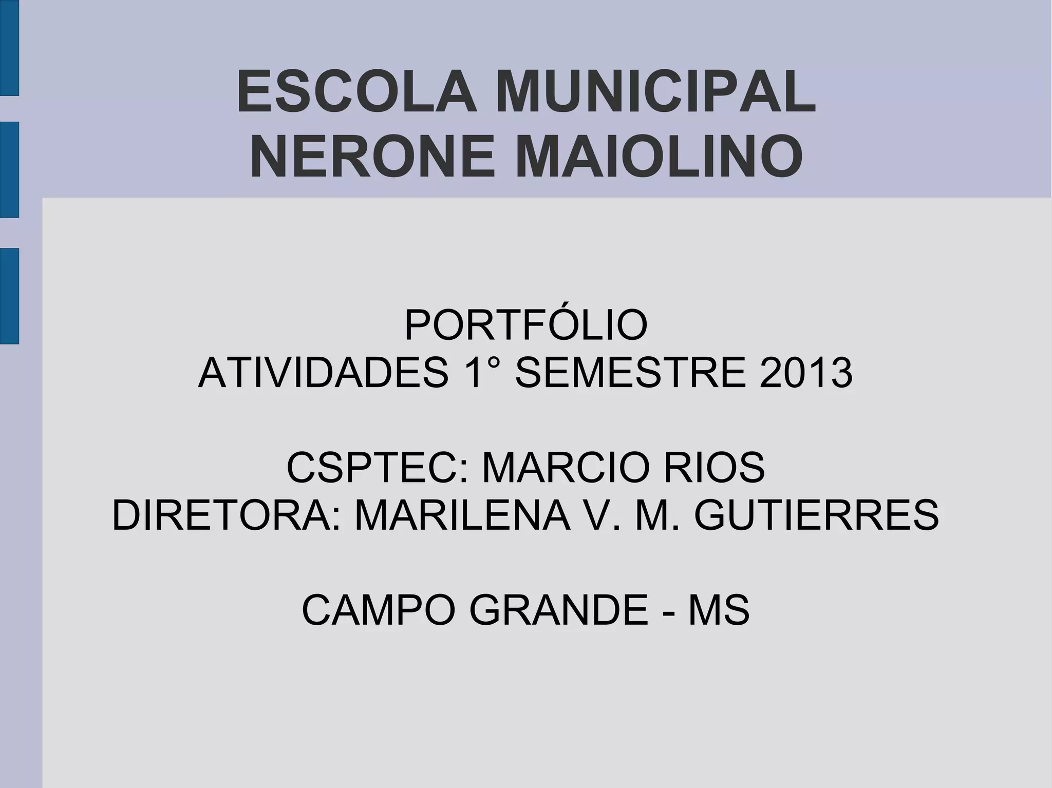 O documento apresenta três projetos desenvolvidos na Escola Municipal Nerone Maiolino no 1o semestre de 2013: 1) Projeto "Bullying" que tem como objetivo discutir e prevenir situações de bullying na escola; 2) Projeto de reescrita de textos que visa aproximar os alunos da escrita através da leitura e reescrita de textos; 3) Projeto "Valorizando o espaço" que tem como meta desenvolver atitudes de respeito no ambiente escolar.