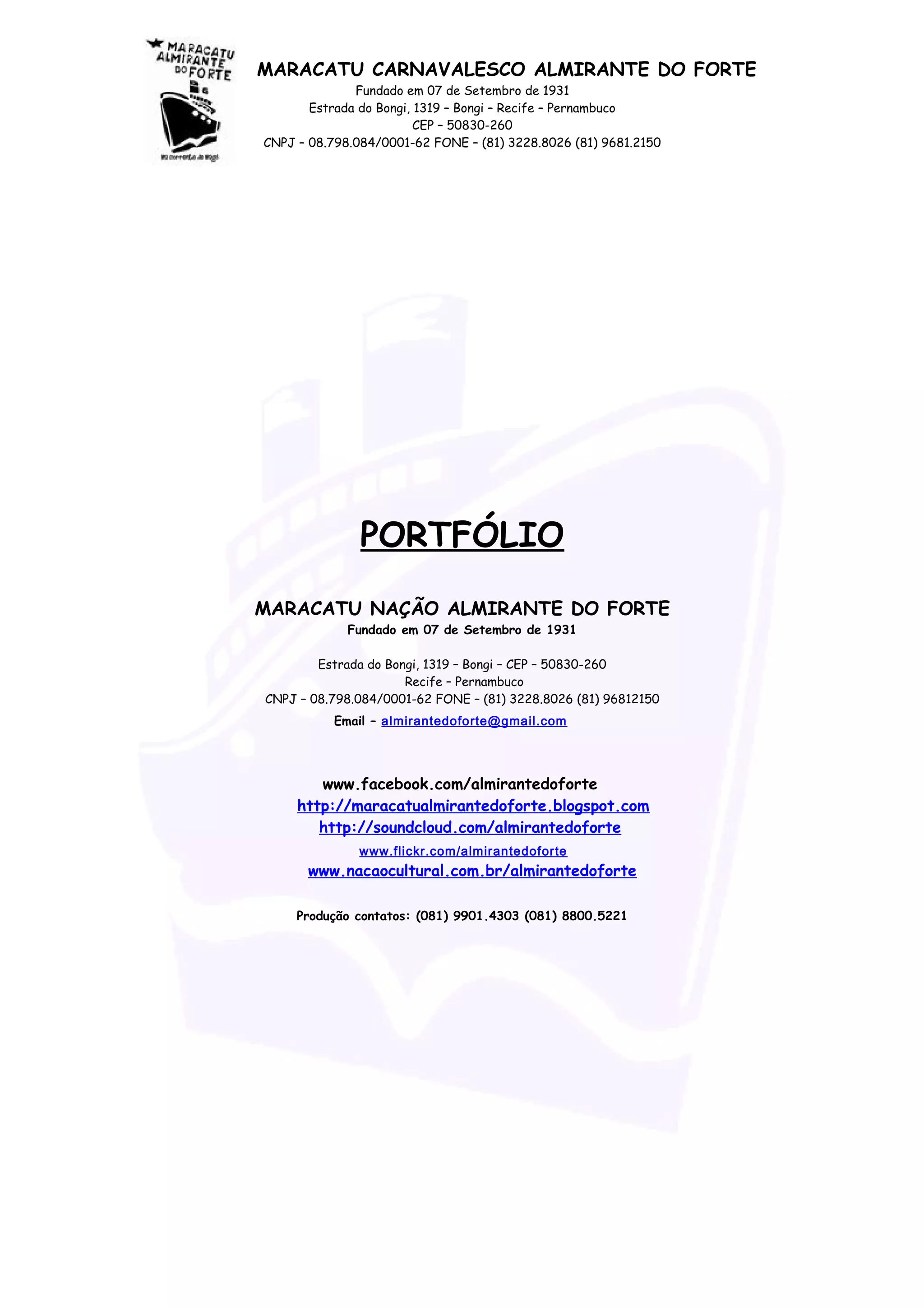 O documento descreve o Maracatu Nação Almirante do Forte, fundado em 1931 em Recife (PE). Detalha sua história, projetos, participações em eventos e oficinas realizadas como parte de seu Ponto de Cultura, incluindo percussão, dança, confecção de roupas, informática e audiovisual.