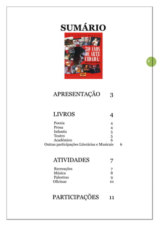 O documento fornece informações sobre as atividades literárias, musicais e teatrais de Luiz Alberto Machado, incluindo seus livros publicados, palestras, oficinas, shows musicais e participações em eventos culturais. O autor possui uma extensa obra literária que abrange poesia, prosa, literatura infantil e acadêmica, além de atividades regulares de difusão cultural por meio de apresentações públicas.